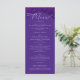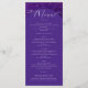 Este elegante cartão de cardápio apresenta um rico fundo roxo adornado com um design decorativo de rendas molhadas no topo, aliado à tipografia de na moda branco, criando uma apresentação sofisticada e ornamentado; o layout destaca uma refinada refeição de casamento multicaminho, incluindo novos iniciantes orgânicos, uma escolha de filete de carne grelhada de carne, medalhões de galinha crua com ervas ou mahi mahi entrées, e uma amêndoa e uma sobremesa de bolo de casamento de baunilha, fazer-a uma escolha eterno e elegante para recepções formais.