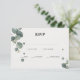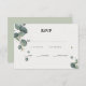 Elegante design de cor d'água botânica eucalipto em cada lado da placa que rodeia as informações do cartão de resposta em uma bela tipografia. Personalize usando os campos fornecidos ou use a função "Personalizar Mais" para ajustar fontes, tamanhos e espaçamento. Se precisar de ajuda ou cores adicionais, entre em contato conosco.
