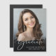 Este anúncio elegante de manutenção magnética de graduação mostra a foto do formando com "Formando" gravada em uma escrita na moda-branca e seu nome, ano escolar e de aula em uma simples tipografia branca.