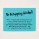 Se você estiver hospedando um chá de exibição sem presentes para uma noiva para ser, este cartão simples e divertido pode ser a escolha para você. Usando uma fonte elegante de script, adicionei primeiro um cabeçalho que dizia "No Wrapping Neanced!" na frente, e "To" e "From" para o lado da etiqueta de presente. O campo de modelo foi criado para oferecer instruções aos convidados que não embrulhassem o seu presente; por favor, sintam-se livres para alterar a redação da forma que quiserem. Há muitos alternativos populares neste texto, se você quiser uma mudança. Todas as fontes e cores podem ser modificadas conforme você vê o ajustado.