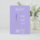 Esta placa RSVP de tendências em cores rosadas é a combinação perfeita da mesma coleção. A design apresenta cor de lavanda clássica e tipografia moderna misturada com caligrafia elegante. O cartão tem um código QR que você pode fazer simplesmente adicionando seu endereço de site de casamento; você pode usá-lo para seu site de casamento ou sua lista de presentes de casamento.