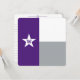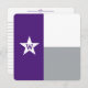 Este design de placa plana é uma reviravolta moderna na icônica bandeira do estado do Texas, com blocos de cor negros em roxo, branco e cinza em um layout que acena para o estado do Lone Star. A proeminente estrela branca com um início personalizável adiciona um toque pessoal enquanto reforça o olhar inspirado no Texas. Limpo e mínimo com um talento colegial, este cartão é ideal para notas escolares, mensagens de obrigado ou artigos personalizados. O verso inclui espaço em linha para o escrevendo e uma opção de personalização de nome, completo com um detalhe de estrela sutil para uni-lo. Perfeito para texanos, estudantes e qualquer um que ama design forte e simples com uma borda sul. Disponível em combinações de cores para todas as principais faculdades e universidades do Texas.