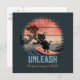 Placa achatada de Cat de Onda Sunset: Um gato preto surfando em uma onda, com o pôr do sol em tons de rosa e laranja, criando uma cena balística e surreal.