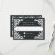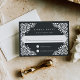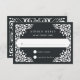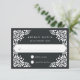 Projetado para coordenar com nossa coleção de casamento Beaux Arts, esta elegante placa RSVP apresenta papel picado fronteira branca moldando sua data de resposta desejada e a sua aceitação e decepção personalizadas, em um rico carvão cardíaco fora do preto.