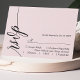 Marque sua presença com um toque de elegância eterno. Esta placa RSVP cor-de-rosa pincelada apresenta um roteiro de caligrafia gracioso, adicionando um toque de sofisticação à sua papelaria de casamento. O design minimalista garante clareza, enquanto a elegante fonte dá um toque de formalidade. Complementa perfeitamente o seu simples tema de casamento, este cartão RSVP se mistura sem esforço com estética romântica, química ou sofisticada. Personalize-o com seus nomes e detalhes de casamento para criar um pacote de resposta coesa para seu dia especial.