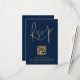 Cartão RSVP de Casamento de Código Qr de Marinho Azul de Script Dourado Elegante. Um gabinete de opções conveniente para pedir aos seus convidados que digitalizem o seu código QR para o seu site de casamento para RSVP. Uma tipografia na moda em ouro para o título principal RSVP complementando o resto do texto que você pode personalizar facilmente.