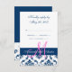 Um monograma elegante e nomes design com marinho e cor damasco branca criam estas adoráveis cartas RSVP que correspondem ao "Convite de casamento de fotos do Monograma do Damasco do Marinho". Design e disposição de Elke Clarke ©2010. Personalize com seus nomes, monograma e texto RSVP de casamento. Para mais opções de edição, selecione "PERSONALIZAR" para alterar o espaçamento, a cor do plano de fundo e da fonte e o estilo da fonte. Damask e foto estão licenciados para uso.