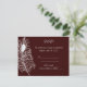 Este cartão RSVP coordena-se com o Convite para Casamento de Feather e apresenta uma pena solteiro branca de pavão colocada sobre um fundo castanho de chocolate. Escolha entre quase 200 cores para personalizar este rsvp para as cores do seu casamento!