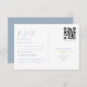 Este cartão chic, branco minimalista e azul empoeirado de RSVP de casamento de dupla função traz um talento contemporâneo, com espaço para nomes de convidados e seleções de menus. Os convidados podem RSVP sem esforço usando o código QR ou optar por enviá-lo de volta tradicionalmente como um cartão postal carimbado. Ideal para um casamento na moda, moderno, que equilibra a conveniência com a tradição do eterno.