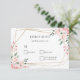 Cartão RSVP de casamento personalizável em branco limpo. Apresentando buquês bonito de flores cor-de-rosa com estrutura geométrica dourada.