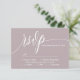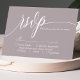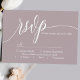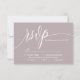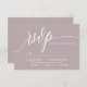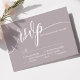 Deixe seu amor florescer com um toque de simplicidade elegante. Esta placa RSVP roxa empoeirada de lavanda apresenta uma fonte moderna de escrita de caligrafia, acrescentando um toque de graça eterno à sua papelaria de casamento. O design minimalista mantém o foco nos detalhes de RSVP, garantindo uma resposta clara e na moda dos seus convidados. Complementando perfeitamente o seu tema de casamento minimalista, esta versátil carta RSVP se mistura facilmente com estética romântica, chica, moderna ou sofisticada. Personalize-o com seus nomes e detalhes de casamento para criar um pacote de resposta coesa para seu dia especial.