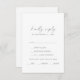 Este moderno cartaz de guião prateado escolhido para RSVP é perfeito para um casamento minimalista. A simples design de cinza de cor prateada apresenta uma tipografia industrial única, com estilo 'boho' moderno. Personalizável em qualquer cor. Mantenha o design mínimo e elegante, como está, ou personalize-o adicionando seus próprios gráficos e trabalhos de arte. Este cartão de resposta do casamento convenientemente pergunta aos hóspedes qual refeição eles gostariam na sua recepção.