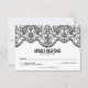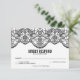Ornamentado de placa RSVP de rendas marroquinas preto e branco e RSVP de casamento elegante apresentando o padrão de local marroquino. Itens correspondentes estão disponíveis.