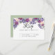 Belas rosas de ameixa e flores cor-de-rosa escamoteadas são entaladas em flores silvestres roxas e folhas verdes salgadas. O RSVP é escrito em uma fonte de script que flui. A parte de trás da placa RSVP é um padrão de folha verde macio.