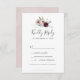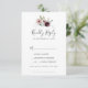Este pedido de RSVP de música romântica floral é perfeito para um casamento elegante. A moderna design do bico rústico apresenta flores românticas a aquarela em tons macios de burgundy, mauve, rosa-pincel e branco-creme com folhas verdes. Crie sua lista de convidados de casamento e sua lista de músicas de dança de uma só vez! Este cartão de resposta do casamento convenientemente pergunta aos hóspedes se eles poderão ir ao seu casamento, e também que música os fará dançar.