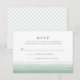 Os cartões RSVP de casamento Elegantes de cor d'água apresentam um efeito de coloração dip de gradiente ombre na parte inferior em verde verde-férn. Personalize com sua data de RSVP desejada, aceite e recuse o texto em blocos de cinza de carvão escuro e tipografia de script. Cartões de resposta reverso para um sutil padrão de latência de diamante em verde-primavera pálido e branco. Projetado para coordenar com a nossa coleção de convites de casamento Dip Dye em Fern.