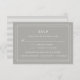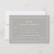 A placa RSVP elegante e simples em cinza neutro Greige cinza-beige apresenta uma borda geométrica que enquadra a data de RSVP desejada e aceita e declina a redação em caracteres clássicos. Adicione suas opções de entrada ou opções de refeição abaixo para permitir que os convidados indiquem sua preferência antes do tempo. Projetado para coordenar com nossa coleção de convites para casamento de Eterno.