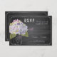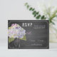Hídrangas de lavanda em Mason jar e cartão RSVP de Chalkboard para um casamento sobre o tema do país.