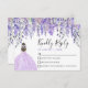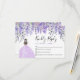 Cartão RSVP do Partido Purple Quinceañera: Esta elegante placa RSVP apresenta agora flores lilás e lavandas de aquarelas roxas maravilhosamente organizadas ao longo do topo da frente, com sombras que vão de violeta profunda a lavanda leve. À esquerda, uma garota com um vestido brilhante roxo maravilhoso adiciona um toque de charme e personalização à design. As costas exibem flores ao longo do topo, juntamente com um falso brilho de tiara para um toque de realeza, e espaço para o nome da aniversariante e "Mis Quince" em um roteiro de na moda. O cartão tem um fundo branco, que pode ser personalizado para qualquer cor para corresponder ao seu tema. As fontes são pretas principalmente com sutis púrpuras para sofisticação adicionada. A frente exibe "Resposta gentil" no topo na caligrafia elegante de script, com espaço fornecido para escrever em nomes individuais ou familiares. Essa design de chic e minimalista garante que ela se emparelha perfeitamente com uma variedade de temas da Quinceañera, acrescentando um toque de classe à sua celebração especial. Totalmente personalizável e disponível como um cartão impresso.