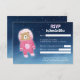 Convide seus hóspedes a responderem no estilo estelar com esta charmosa placa RSVP, mostrando um urso de astronauta cor-de-rosa a derivar através de um céu estrelado profundo. O design de temática espacial adiciona um toque lúdico e moderno ao seu conjunto de eventos. Inclui áreas para nome, frequência, preferências alimentares e data de resposta. Uma forma doce e criativa de recolher respostas para a sua celebração.
