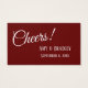 Quer oferecer aos seus hóspedes uma maneira de desfrutar de várias bebidas alcoólicas durante a sua recepção ou festa sem se comprometer com um bar aberto? Estes bilhetes de bebidas de 3 socos podem ser ideais para ti! Em uma bonito letra branca, a mensagem na frente diz "Beba algumas bebidas em nós!". O texto é editável, se você desejar uma mensagem diferente. Girado, à direita e colocado entre linhas finas são as palavras "Resgatar no Bar"; este texto também é editável. Três círculos numerados foram adicionados à direita para que seus convidados possam ter suas cartas perfuradas no bar enquanto são servidos até três bebidas complementares. Abaixo da palavra "Saúde!", o outro lado tem campos de modelo configurados para seus nomes e data. Basta usar campos de modelo para adicionar seus detalhes pessoais e reformular qualquer uma das frases. Altere o plano de fundo para qualquer cor que você quiser.
