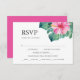 Esta placa de receptáculo de resposta apresenta uma parte superior das folhas de palma com uma flor de hibisco em tons vibrantes de rosa e verde. É fornecido espaço para os convidados adicionarem suas informações de resposta e uma simples escolha de refeição. A placa se reverte para cor-de-rosa complementar. Uma escolha simples, mas elegante, para casamentos tropicais de destino. Para ver mais sobre o tema do casamento de flores de hibisco rosa, visite https://www.zazzle.com/collections/pink_hibiscus_flower-119064582807479077 Arte e design únicas de Victoria Grigaliunas do Do Tell A Belle.