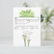 Este design apresenta flores brancas de lírio calla e um traço de tinta verde de aquarela no fundo. Um design elegante que representa verde através da utilização de aquarela que corresponde aos caules verdes dos lírios. Este simples, mas elegante design floral pode ser incorporado em qualquer tema de casamento. Design de cartão de aceitação RSVP de casamento exclusivo com elementos modernos. Os convites de casamento e outros artigos de papelaria também estão disponíveis.