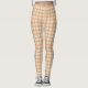Plaid leggings with a vibrant orange, blue, and white pattern are shown on a person wearing black sneakers. The background is plain beige.