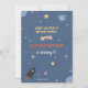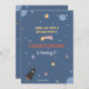 Um convite de aniversário no espaço externo com planetas, estrelas, estrelas atiradoras e foguetes em estilo de desenho animado em fundo azul. Você pode jogar uma festa de aniversário divertida para uma criança que ama o espaço!