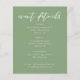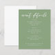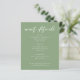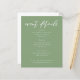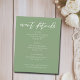 Esta simples folha de detalhes do evento de casamento verde de sábio apresenta uma elegante tipografia branca para uma cerimônia ao ar livre em um cenário natural. Escrito minimalista em uma cor verde-clara pacífica para um lugar rústico perto de uma floresta de árvores.