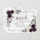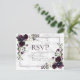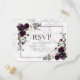 Moderna e moderna, este convite para o casamento RSVP Postcard design apresenta a cor d'água eucalipto verde e arranjos florais roxos de ameixa, com textura falsa de mármore branco, com "RSVP" em uma cor de ameixa correspondente. Parte de um jogo de casamento. Convidados Elegantes de Direitos Autorais. Todos os direitos reservados.