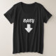 Flashback às camisas de maternidade com "Baby" e uma seta para baixo sobre elas nos anos 80. Diversão e Design para a futura mãe — uma camiseta-mãe com o espaço que você precisa para se manter confortável durante a gravidez. Tipografia Preta e Branca.