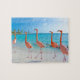 flamingos cor-de-rosa numa quebra-cabeça de praia arenosa branca.