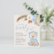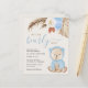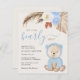 Boho, um convite de chá para bebês, amigável ao orçamento, com uma aquarela de um ursinho bonitinho, um buquê de grama e flores para pampas, azuis e terracotta e "Nós podemos esperar muito" numa mistura de simples tipografia e um roteiro de inchaço azul na moda.