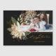 A elegante poinsettia branca artística, folhas verdes, pinheiro de inverno, verde-ouro e faíscas com caligrafia personalizada "Feliz Natal" e borda falsa de ouro para sua foto de Natal em fundo preto. Inclui campo de texto editável.