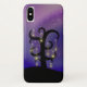 Uma paisagem de fantasia digitalmente desenhada de árvores silenciadas com fruta em estrelas e luas. Dos ramos escuros pendura cadeias ouros de miçangas terminando em uma variedade de formas estelares brilhantes, luas de crescente e luas de cheio, cada uma acoplada ao galho por um estouro espumante. O fundo é um céu em azul e cor-de-rosa girando, coberto por minúsculas faíscas de luz, com uma trilha espiralável de estrelas reluzentes circulando pelas árvores.