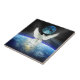 Uma pomba branca da paz espalha suas asas acima do horizonte azul da terra do planeta com uma lua azul de néon no fundo. O nascer do sol brilha na borda do mundo e os raios claros banham a terra. Este é um design bonito para promover a paz de mundo e a unidade por o ano novo, Dia da Terra, ou para toda a ocasião. Para cristãos, a pomba é um símbolo do Espírito Santo, do espírito da paz, ou do espírito do deus.