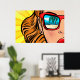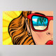 Uma legal pop de arte em óculos de sol com a praia refletindo em seus óculos. Excelente com uma simples estrutura preta.