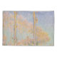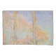 impressionist landscape painting depicting three poplar trees on the Banks of the Epte River near Giverny, Eure, Normandy, France, in fall, ln the light of a late afternoon sunset. Thee deep blue sky contrasts with the warm pink orange and yellow leaves, the foliage is reflected in the waters of the river
