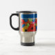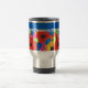 Uma caneca de viagem de cor brilhante, personalizável, com um padrão vibrante e colorido de papoilas e flores de milho, de um design pintado à mão por Judy Adamson.
