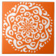 Esta mandala branca senta-se sobre um fundo laranja brilhante. A cor é brilhante e criativa. Parte da Coleção Kylgh Mandala. Este design pode não ser impressão tão brilhante quanto aparece on-line.