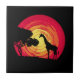 Ilustração do pôr do sol africano com sol vermelho, girafa e decoração da silhueta de árvore em fundo preto. É possível mudar a cor de fundo e adicionar uma diferente à design com sua escolha.