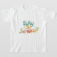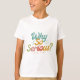 A design da camiseta apresenta a frase "Por que tanta gravidade?" em letras negrito e multicoloridas contra um fundo comum. As cores são vibrantes e divertidas, criando uma vibração divertida e enérgica. A design é simples, mas atraente para os olhos, fazer uma opção versátil e na moda para qualquer armário
