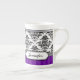 A cor damasco preto e branco elegante projetou por Liz Molnar na caneca de China de osso com fita de prata, etiqueta, texto customizável e as listras pálidas no fundo variável da cor.