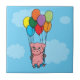 Caracterizando uma ilustração digital do porco cor-de-rosa usando um grupo de balões multicoloured para voar altamente no céu azul nebuloso.