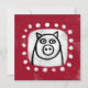 Um porco desenhado em preto e branco sobre um fundo texturizado vermelho cercado de pontos brancos.