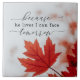Azulejo de cerâmica inspiracional retrata uma simples fotografia da natureza de queda com uma folha vermelha. Ele apresenta o encorajador e amado hino cristão culto, "Porque ele vive que eu posso encarar amanhã." Imagem de outono de Cole Keister, Unsplash.