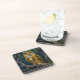 A beautiful coaster with a gold and blue owl sitting on a tree branch. This illustration has an impasto oil painting style.