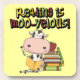 Uma vaca preto e branco relaxa com uma pilha de livros como lê na leitura é os t-shirt MOO-Velous, as canecas, os cartões, as etiquetas, as bolsas, os ímãs, o chaveiro, os jornais, os travesseiros, e os outros artigos do roupa e do presente que promovem ler. Excelente para sem-fins de livro de alguma idade!