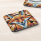 Esta é uma pintura abstrato cubista intitulada A Raposa. Os olhos da raposa estão brilhando. A arte apresenta formas geométricas laranja, vermelha e dourada. A porta copos é uma porta copos de plástico duro. O conjunto de portas copos contém seis portas copos.